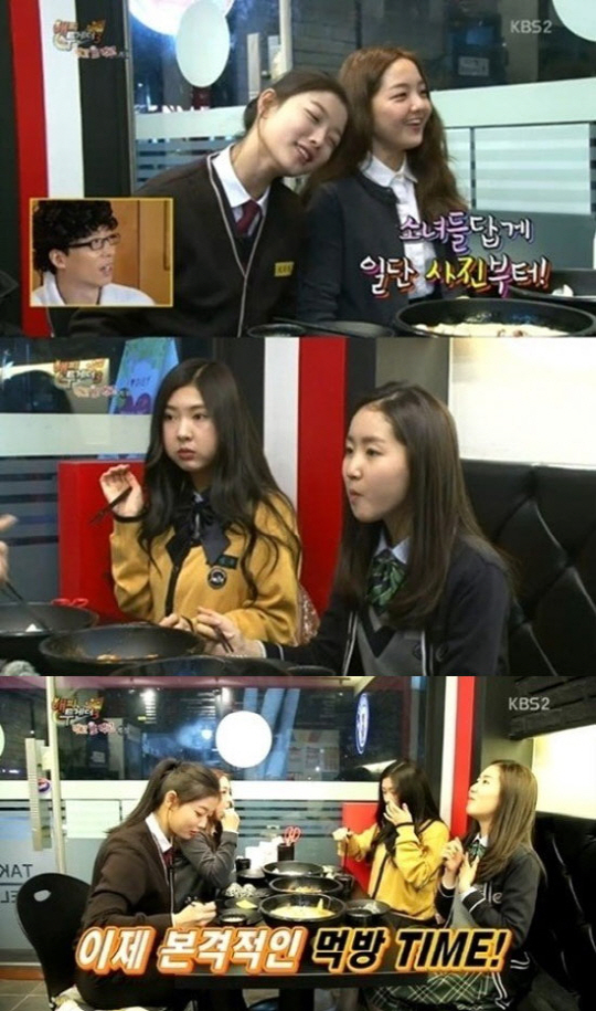 특히 김유정은 간장을 시키더니 떡볶이를 간장에 찍어 먹어 다른 배우들로부터 "화성인이다"는 소리를 들었다. 하지만 김유정처럼 먹어보던 진지희는 "생각보다 맛있다"며 놀라운 표정을 보였다.