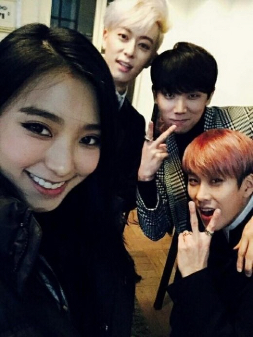 공개된 사진 속 보라는 '보이프렌드' 동현과 현성, 정기고와 함께 다정하게 카메라를 응시하고 있다.