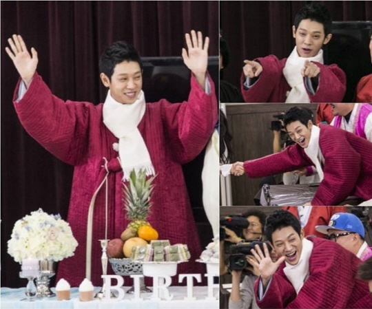 공개된 사진 속에는 정준영이 붉은 도포를 입고 하얀 목도리를 장착해 꽃도령으로 변신한 모습이 담겨있다. 그는 예쁘게 웃어 보이며 두 팔을 번쩍 들어 만세를 하는 듯한 포즈를 취하고 있는데, 그 모습이 '오늘은 내가 주인공'이라는 듯 자신감이 넘쳐 보여 웃음을 유발한다.