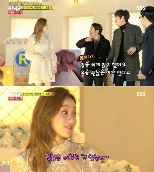 이날 이성경은 하하가 지목한 선물 상자를 뚫고 등장했고, 이성경의 등장에 이광수는 밝게 반겼다. 이성경과 이광수는 최근 종영한 드라마 '괜찮아, 사랑이야'에서 연인 호흡을 맞춘 바 있다.