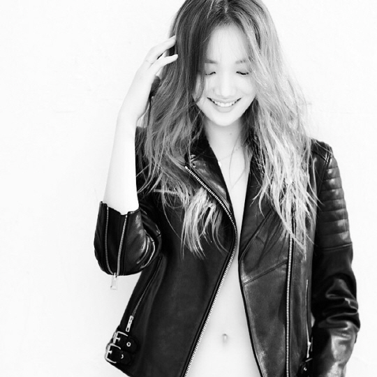 사진은 키 176cm의 이성경이 알몸 상체에 검은 가죽자켓만 걸친 아찔한 화보 사진