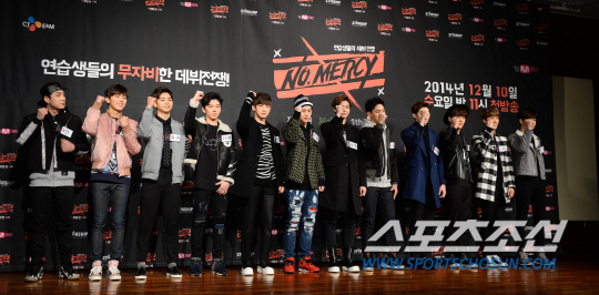 12명의 연습생들이 8일 여의도 63시티에서 열린 서바이벌 프로그램 Mnet '노머시(NO. MERCY)'의 제작발표회에서 포토타임을 갖고있다. '노머시(NO. MERCY)'는 케이윌, 정기고, 매드클라운, 보이프렌드, 주영 등 최고 아티스트를 보유한 스타쉽 엔터테인먼트가 신인 힙합 보이그룹의 최종 멤버를 가리기 위해 라이머, 산이, 기리보이, 천재노창 등 최강의 래퍼, 프로듀서들과 콜라보 미션을 선보이는 서바이벌 프로그램이다 여의도=최문영 기자 deer@sportschosun.com /2014.12.08/