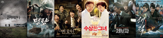 흥행 성적 면에서는 '명량'이 최고다. 이순신 장군의 명량대첩을 재구성한 이 작품은 역대 흥행 기록을 모조리 갈아치우더니 결국 1760만 9019명(영화진흥위원회 영화관입장권 통합전산망 집계기준)의 관객을 불러모으며 '아바타'가 지켜온 역대 박스오피스 순위 1위까지 가로챘다. "신에게는 아직 12척의 배가 남아있사옵니다"라는 명대사는 각종 예능 프로그램에서 패러디되며 올 한해 최고의 유행어로 자리잡기도 했다.