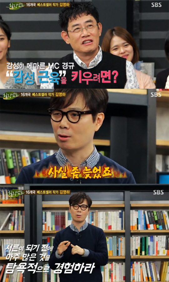 이날 MC 이경규는 "감성근육을 키워라"는 김영하의 말에 "나이 먹으면 감성 근육 키우기가 어렵다. 약이라도 먹어야 하나?"라고 질문했다.