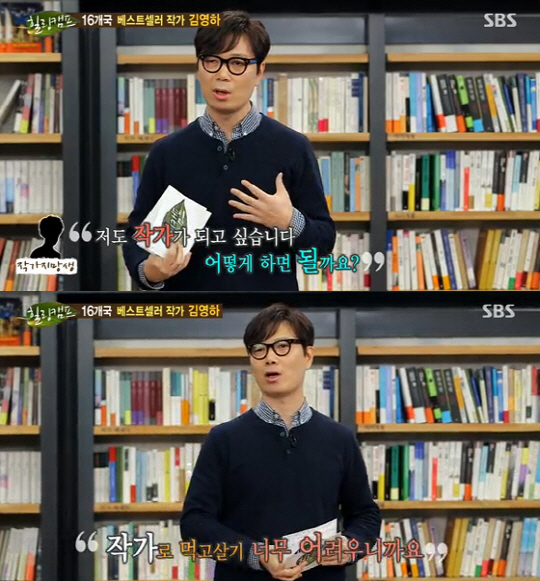 이날 김영하는 "자기가 작가가 되고 싶은데 어떠한 충고를 해 줄 수 있느냐고 묻는데, 작가로 먹고살기 어렵다. 하지 말라"고 말했다.