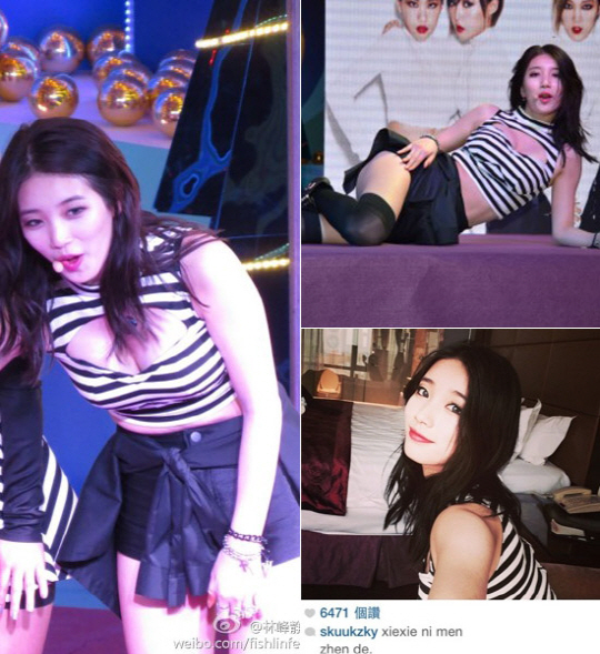 현지 팬들에 의해 중국 SNS에도 다수 게재된 수지의 사진은 가슴골을 강조한 줄무늬 상의와 아찔한 길이의 핫팬츠로 섹시한 매력을 과시한 모습이다.