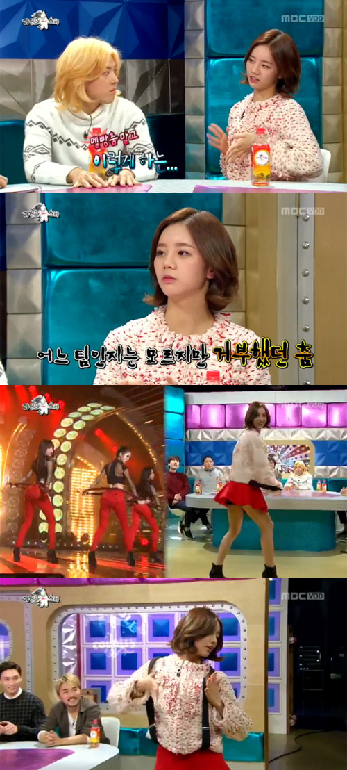 이날 MC 김국진은 "걸스데이 '기대해'라는 노래의 안무인 '멜빵춤'이 다른 걸그룹이 거부해서 걸스데이에게 왔다더라"며 운을 뗐다.