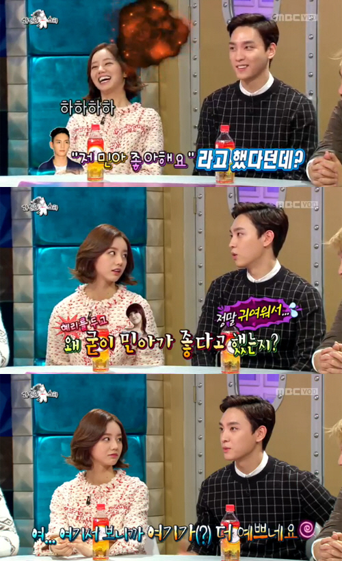 이날 MC들은 "최태준이 오늘 혜리가 나온다니까 '민아 좋아해요'라고 했다던데 혜리가 나오는데 왜 굳이 민아가 좋다고 했냐"고 물었다.