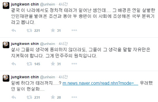 이어 진 교수는 "설사 그들의 생각에 동의하지 않더라도, 그들이 그 생각을 말할 자유만은 지켜줘야 합니다. 그게 민주주의 원칙입니다"라며 "결국 이 나라에서도 정치적 테러가 일어난 셈이다. 그 배경은 연일 살벌한 인민재판을 벌여온 조선과 동아 두 종편이 이 사회에 조성해온 극우 분위기라고 봅니다"라고 덧붙였다.