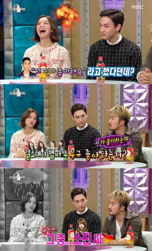 이날 MC들은 "최태준이 오늘 혜리가 나온다니까 '민아 좋아해요'라고 했다던데 혜리가 나오는데 왜 굳이 민아가 좋다고 했냐"고 물었다.
