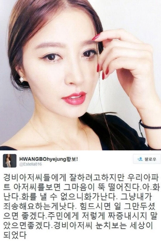 방송인 황보가 자신이 거주하는 아파트 경비원들에 대한 글을 올렸다 비난을 받자 사과의 뜻을 전했다.