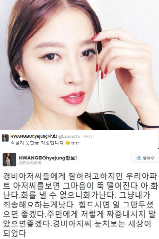 하지만 황보의 트위터 글은 시기상 적절하지 못 한 글로 일부 네티즌들에게 비난을 받았다. 이는 이날 앞서 지난달 7일 서울 강남구 압구정동 S 아파트에서 한 경비원이 주민들의 비인격적인 대우에 비관, 스스로 목숨을 끊은 사건과 관련해 해당 아파트에서 11일 주민이 경비원을 폭행해 코뼈를 부러뜨리는 사건이 또 발생 했기 때문. 이에 황보는 자신의 글을 삭제하고 사과의 글을 게재했다.