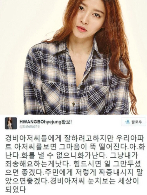 앞서 황보는 트위터를 통해 자신이 거주하고 있는 아파트 경비원에 대한 불만을 토로했고, 해당 글은 비난을 받았다.