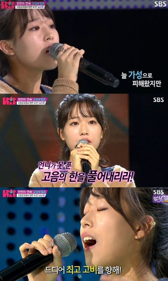 남소현이 선택한 노래는 픽시로트의 '크라이 미 아웃'. 남소현은 "고음 되든 안 되든 막 질러봐"라는 심사위원들의 응원을 받자 예선 때와 달리 자신있는 고음을 당당하게 뿜어냈다.