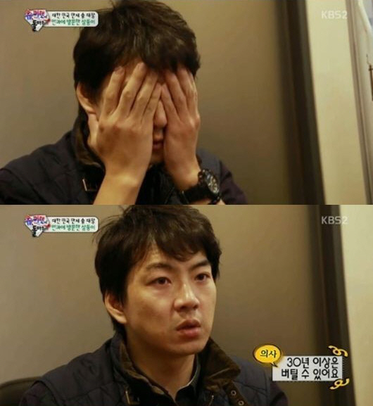 이에 의사는 송일국의 눈을 검사하며 충격적인 결과를 전했다. 의사는 "시신경의 80%가 손상돼 치료가 시급하다"며 "약물 치료를 하지 않을 경우 10년 내에 시력을 잃을 수도 있다"라고 밝혔다. 또 "약물치료를 하면 30년 정도 버틸 수 있다"라고 덧붙였다.