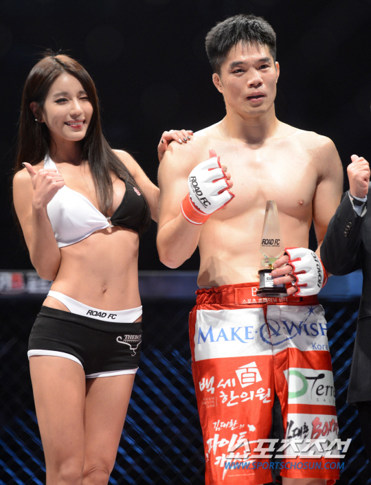 사진은 로드걸 박시현이 승리한 김대환 옆에서 함께 포즈를 취하고 있는 모습. 김대환 보다 더 눈에 띄는 비주얼로 남성팬들을 설레게 하고 있다.