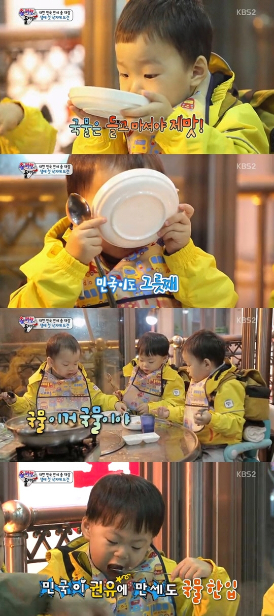 특히 삼둥이 중 대한과 민국은 얼큰한 낙지 국물에 관심을 보이며 어른스러운 입맛을 자랑해 보는 이들의 미소를 자아냈다.