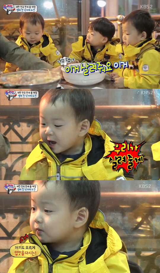 지난 14일 방송된 KBS2 '슈퍼맨이 돌아왔다'에서는 송일국과 삼둥이 대한 민국 만세가 생애 첫 낙지 시식에 나선 모습이 전파를 탔다.