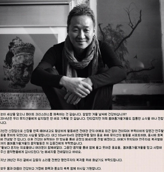 이어 "대신 SSaW Ent의 경영업무를 맡아 동료 후배 뮤지션의 활동을 서포트하며, 동시에 회복에 전념할 것 입니다. 이후 건강이 허락하는 한 방송을 통해 긍정의 메세지를 전할 예정이고, 어깨가 완치되어 연주자로 복귀할때까지 봄여름가을겨울의 음악활동은 저 김종진에게 부탁했습니다"라고 덧붙였다.