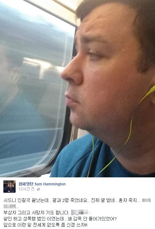 샘 해밍턴은 16일 오전 자신의 SNS에 "시드니 인질극 끝났는데. 결과 2명 죽었네요. 진짜 열 받네. 혼자 죽지"라고 범인을 비난하며 "부상자 그리고 사망자 기도 합니다. 앞으로 이런 일 전세계 없도록 좀 신경 쓰자!!"라고 고인의 명복을 빌었다.
