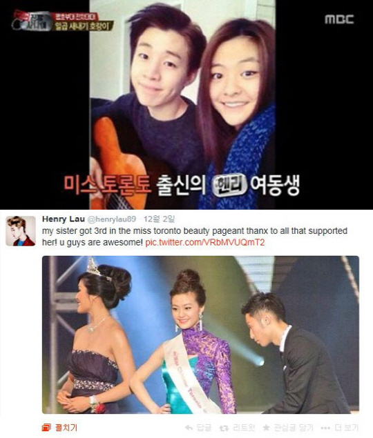 공개된 사진 속에는 헨리와 함께 또렷한 이목구비에 매력적인 미소를 띠고 있는 헨리의 여동생의 모습이 담겨있어 시선을 집중시켰다. 앞서 미스 토론토 3위에 입상한 바 있는 헨리의 여동생은 캐나다 명문 토론토대에서 경영학과 프랑스어를 전공하고 있는 것으로 알려졌다. 뿐만 아니라 중국어, 영어, 프랑스어 등을 원어민 수준으로 구사하는 엄친딸로 유명하다.