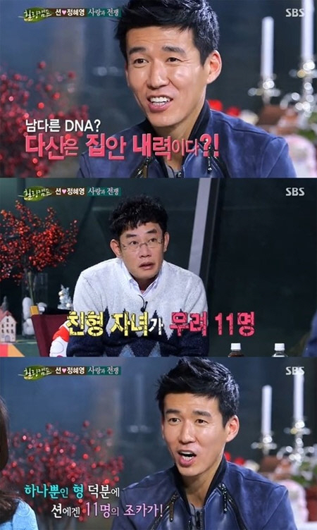 이어 MC 이경규는 "다산이 집안 내력이라면서요?"라고 물었고, 션은 "그렇다. 친형이 아이가 11명 있다"고 답해 놀라움을 안겼다.
