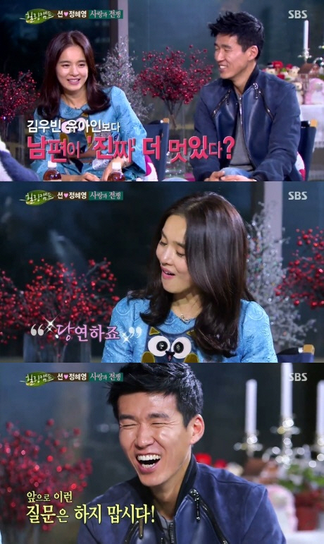 하지만 이내 정혜영은 "김우빈 유아인보다 션이 더 멋있다"며 애정이 담긴 눈빛을 보내 부러움을 자아냈다.