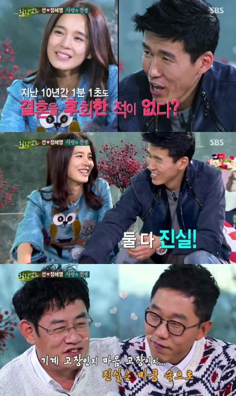 MC들은 션과 정혜영 부부에게 "1분 1초도 결혼을 후회한 적이 없냐"고 질문했고, 이들 부부는 망설임 없이 "없다"고 답했다.