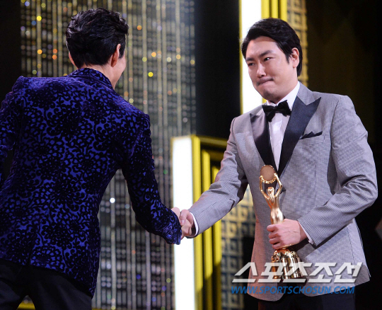 제 35회 청룡영화상 시상식이 17일 서울 신문로 세종문화회관에서 열렸다. 남우조연상을 수상한 조진웅이 시상자 이정재이 축하를 받고 있다.