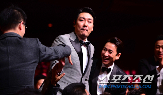 17일 오후 서울 종로구 세종로 세종문화회관에서 제35회 청룡영화상 시상식이 열렸다. 남우조연상을 받은 조진웅이 동료들의 축하를 받고 있다.