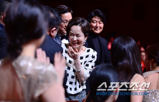 17일 오후 서울 종로구 세종로 세종문화회관에서 제35회 청룡영화상 시상식이 열렸다. 여우조연상을 받은 김영애가 동료들의 축하를 받고 있다.