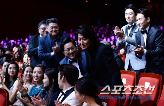 제 35회 청룡영화상 시상식이 17일 서울 신문로 세종문화회관에서 열렸다. 남우주연상을 수상한 송강호가 동료배우들의 박수를 받으며 일어서고 있다.