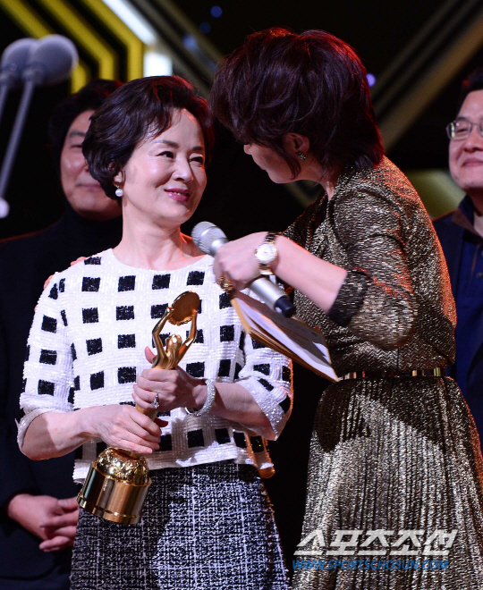 17일 오후 서울 종로구 세종로 세종문화회관에서 제35회 청룡영화상 시상식이 열렸다. 김혜수가 김영애에게 축하인사를 하고 있다.