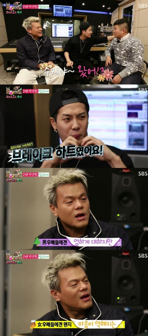 이에 박진영은 "당연히 남자 후배들은 엄하게 하는데 여자 후배들에게는 마음이 약해져 그렇게 못하겠다"고 털어놨다. <스포츠조선닷컴>