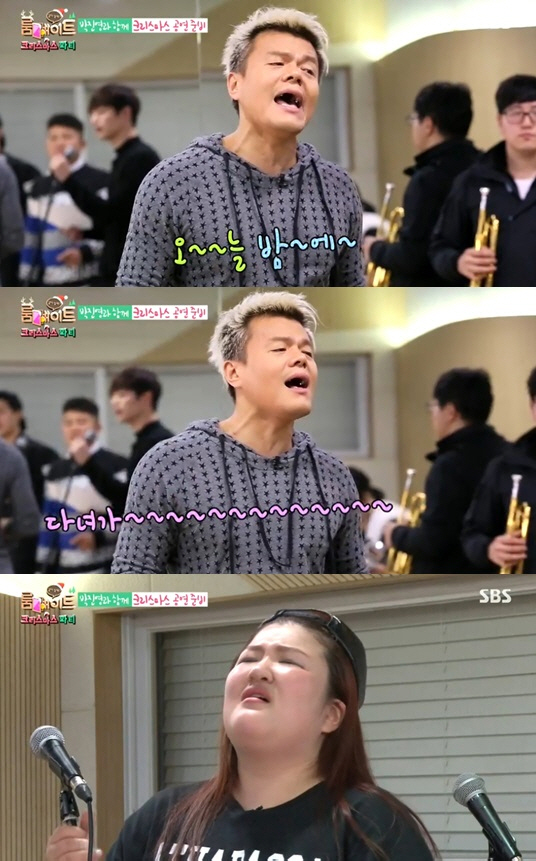 이날 박진영은 '룸메이트'의 크리스마스 공연 준비를 도왔다.
