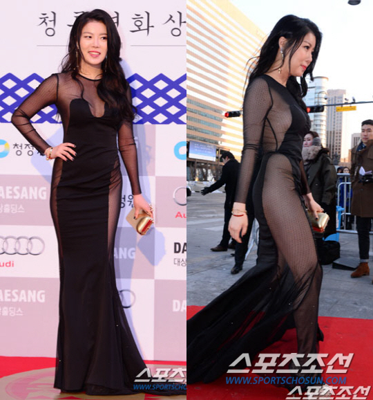 이날 레드카펫 행사에 참석한 노수람은 과감한 파격 드레스로 모두의 시선을 사로 잡았다. 검은색 드레스를 입은 노수람은 주요 부위를 가린 채 가슴라인은 물론 옆라인 전체를 드러낸 시스루 스타일을 선보였다. 노수람이 한발 한발 옮길때 마다 아슬한 장면이 연출돼 많은 화제를 모으고 있다.