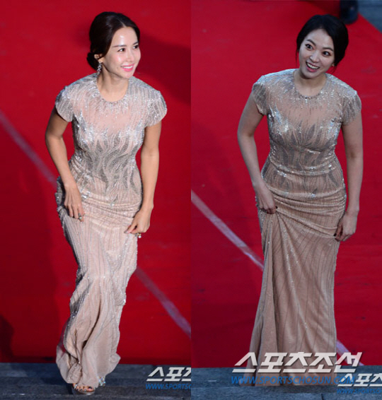 이날 시상식에 앞서 열린 레드카펫에서 조여정과 천우희가 같은 드레스를 입고 등장했다. 천우희와 조여정이 함께 선택한 드레스는 누드톤에 실버 장식으로 은은한 멋을 내는 스타일로 특히 밀착된 롱 드레스가 몸매를 고스란히 드러내고 있어 더욱 눈길을 끈다.