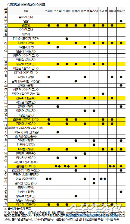 김형중(스포츠조선 문화사업부 부장), 노종윤(제작자/웰메이드필름 대표), 원동연(제작자/리얼라이즈픽쳐스 대표), 정보석(배우), 조의석(영화감독), 조진희(교수/숙명여대 언론정보학부), 조혜정(교수/중앙대 예술대학원), 홍지영(영화감독) (가나다 순), 네티즌투표