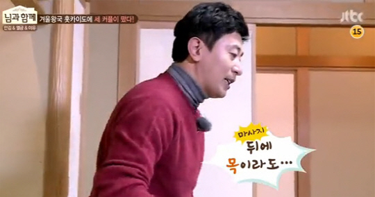이날 지상렬은 정통 료칸으로 세 커플을 안내했다. 안문숙은 "두 커플은 부부니까 한방을 쓰는데 우리는 어떻게 하냐"고 물었다. 그러자 사유리는 "범수 오빠를 믿으라"며 너스레를 떨었고, 지상렬도 "누나 별거 아니다"라고 말했다.