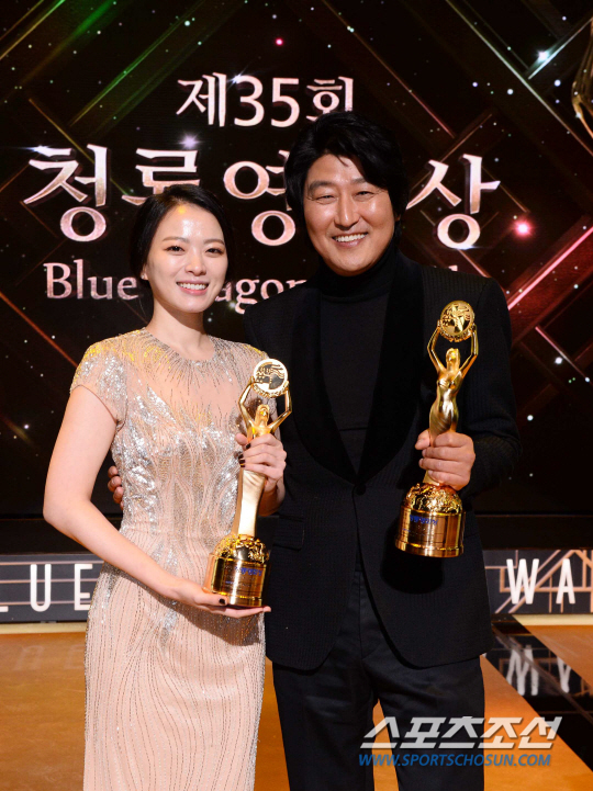 제 35회 청룡영화상 시상식이 17일 서울 신문로 세종문화회관에서 열렸다. 남녀주연상을 수상한 송강호, 천우희가 함께 포즈를 취하고 있다. 최문영 기자 deer@sportschosun.com/2014.12.17/