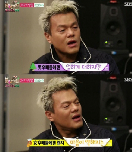 이에 박진영은 "당연히 남자 후배들은 엄하게 하는데 여자 후배들에게는 마음이 약해져 그렇게 못하겠다"고 털어놔 웃음을 안겼다. <스포츠조선닷컴>
