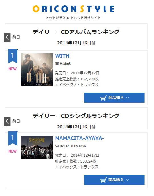 동방신기는 지난 17일 발매한 일본 새 앨범 'WITH'로 발매 당일 오리콘 데일리 앨범 차트 1위를 차지했으며, 슈퍼주니어 역시 같은 날 출시한 일본 새 싱글 'MAMACITA-AYAYA-'로 오리콘 데일리 싱글 차트 1위에 등극, 앨범과 싱글 부문에서 동시에 1위를 석권하는 기염을 토해, 현지에서의 뜨거운 관심을 확인시켜 주었다.
