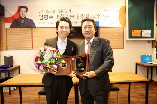 한국이 낳은 세계적 팝페라테너 임형주가 유네스코한국위원회으로부터 국내 최초의 '평화예술 친선대사'로 위촉되어 지난 18일 오후 4시 서울 명동 유네스코회관 유네스코홀에서 열린 위촉식에서 민동석 유네스코한국위원회 사무총장으로부터 직접 위촉패와 대형명함을 전달받았다.
