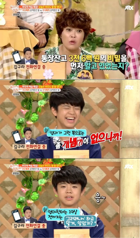 이에 제작진은 김구라와 직접 전화를 연결했고 김구라는 "동현아, 알면 다쳐. 엄마가 그런쪽으로는 개념이 없으니까"라며 "엄마한테는 19세 전까지 번 돈을 다 주기로 했으니까 '그러려니'하고 맡겨, 알았지?"며 아들을 달랬다.