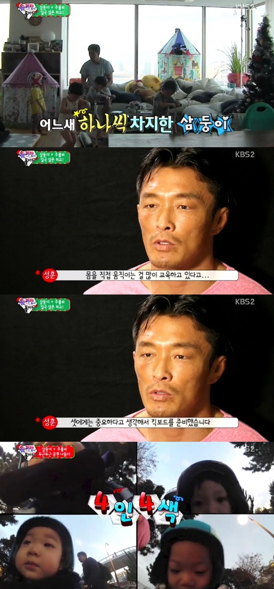 이날 추성훈은 직접 만든 햄버그 스테이크를 아이들에게 대접했고, 늘어지게 낮잠을 잔 뒤 삼둥이를 위한 선물을 꺼냈다.