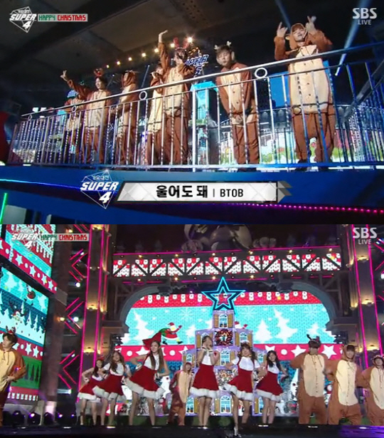 이날 비투비는 크리스마스 스페셜 무대에서 캐롤송인 신곡 '울어도 돼'를 열창했다. 특히 멤버들은 루돌프 의상을 입고 등장, 깜찍함을 발산해 팬들의 환호성을 이끌어냈다.