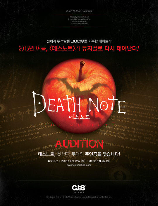 한편 '데스노트' 오디션은 12월 22일부터 1월 5일까지 씨제스컬쳐 공식 홈페이지(www.cjesculture.com)를 통해 접수 가능하다. 이정혁 기자 jjangga@sportschosun.com