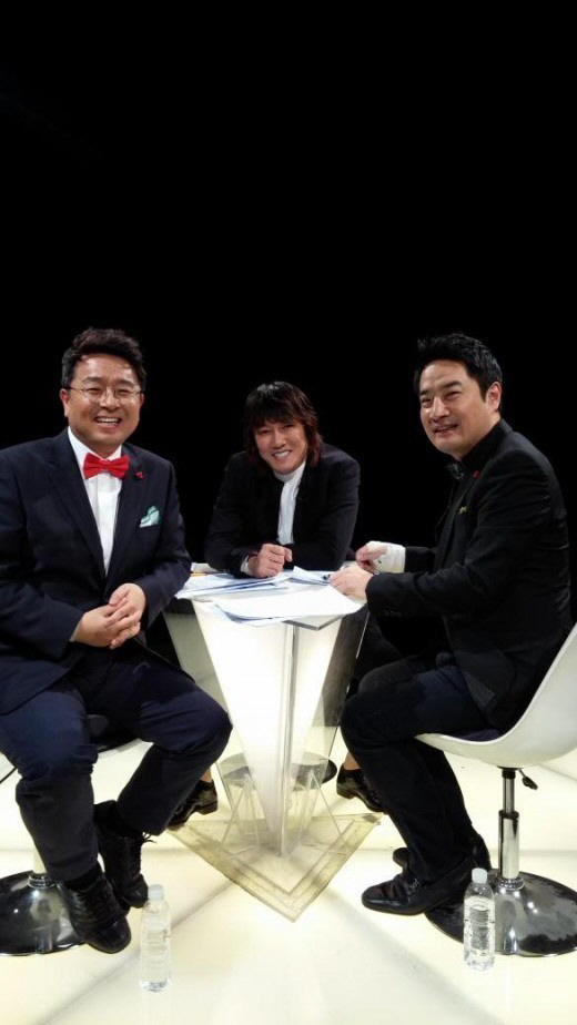 공개된 사진 속 김장훈은 썰전 녹화실에서 이철희, 강용석과 나란히 앉아 환한 미소를 지으며 카메라를 응시하고 있다.