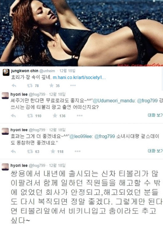 이효리는 "쌍용에서 내년에 출시되는 신차 티볼리가 많이팔려서 함께 일하던 직원들을 해고할 수 밖에 없었던 회사가 안정되고, 해고되었던 분들도 다시 복직되면 정말 좋겠다. 그렇게만 된다면 티볼리앞에서 비키니 입고 춤이라도 추고싶다"고 밝혔다.