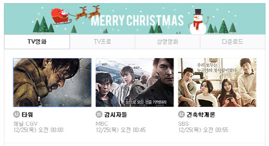 성탄절에는 각 방송사별로 다양한 영화를 준비했다. 채널 CGV는 '타워' '나 홀로 집에' 시리즈, MBC는 '감시자들', SBS에선 '건축학개론', KBS에선 '넛잡: 땅콩 도둑들'이 방송된다.
